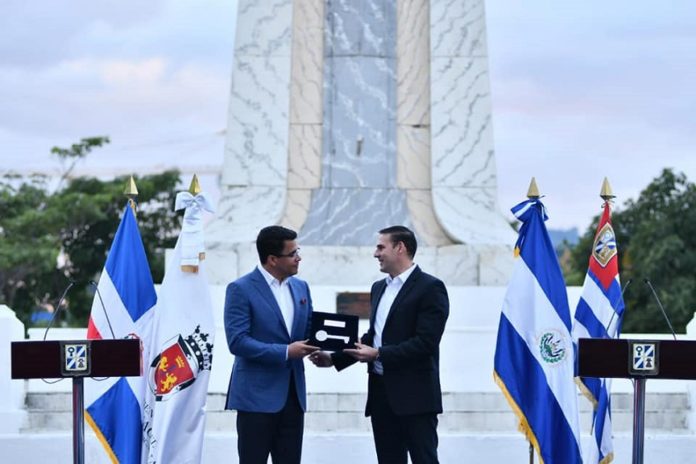 El alcalde de San Salvador, Ernesto Muyshondt, entregó el viernes las llaves de la ciudad capital a su homólogo de República Dominicana, David Collado, quien realiza una visita a la capital para conocer sobre la ejecución de proyectos municipales como Canchas para Todos.