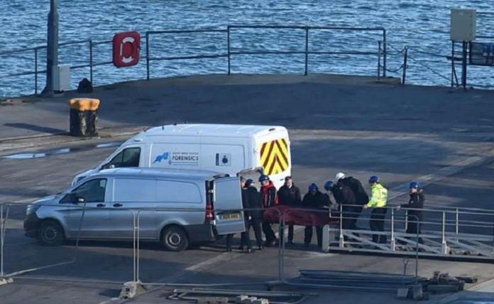 La tripulación del Geo Ocean III transportó el cuerpo que había rescatado a 63 metros de profundidad del Canal de la Mancha. Lo recibieron dos automóviles policiales y lo entregaron al perito forense o coroner de la ciudad de Dorset, que será el encargado de iniciar el reconocimiento tras el traslado en una ambulancia privada plateada.