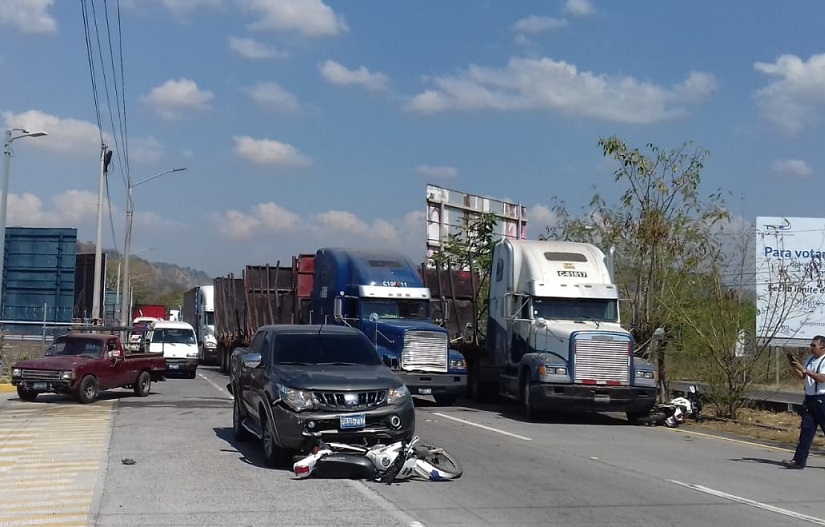 Según la información, dos agentes motorizados que transitaban por el kilómetro 37 en el sentido que del aeropuerto conduce hacia San Salvador fueron impactados por una camioneta y una rastra.
