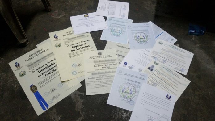 Más de cien títulos de diferentes universidades, sellos oficiales, así como placas de circulación de vehículos y motocicletas, todos falsos, fueron decomisados por policías de la Delegación San Salvador, quienes detuvieron a tres personas, en dos negocios ubicados sobre la alameda Juan Pablo Segundo y avenida Monseñor Romero.