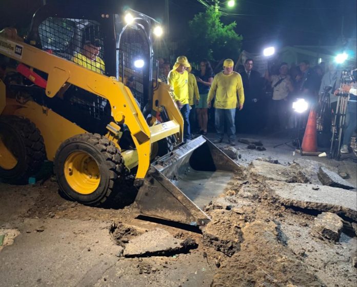 El Ministro Romeo Rodríguez movilizó a cuadrillas de trabajadores al municipio de Mejicanos, a sectores populares como: Residencial La Gloria, Colonia Santísima Trinidad, donde se han identificado puntos cuyas calles se encuentran en más del 60% dañadas, debido a que en el pasado no se les dio el mantenimiento necesario.