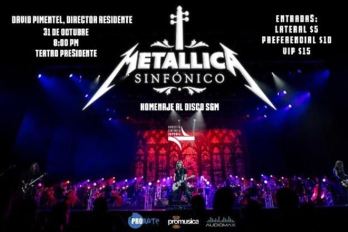 La Orquesta Sinfónica Juvenil de El Salvador (OSJ) presenta el show Metallica Sinfónico, Homenaje a los 20 años del disco S&M de la banda estadounidense Metallica, bajo la dirección del Maestro David Pimentel, acompañados de un selecto grupo de músicos que integran este gran homenaje a realizarse el día jueves 31 de octubre, a partir de las 8:00PM, en las instalaciones del Teatro Presidente.