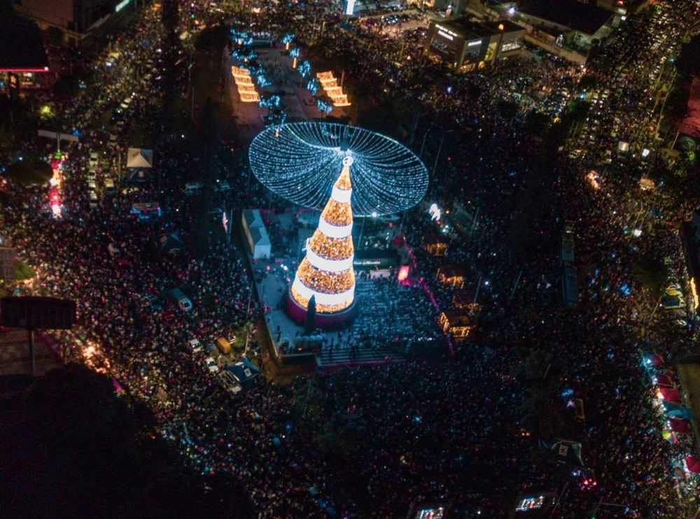 El gigantesco árbol navideño, que es el más grande de El Salvador y Centroamérica, cuenta con más de 35 metros de alto, más de 40 mil luces led, 5 mil bombillos E14, y 24 guirnaldas Flash. Otro de sus atractivos es la composición de 4 anillos con luces led.