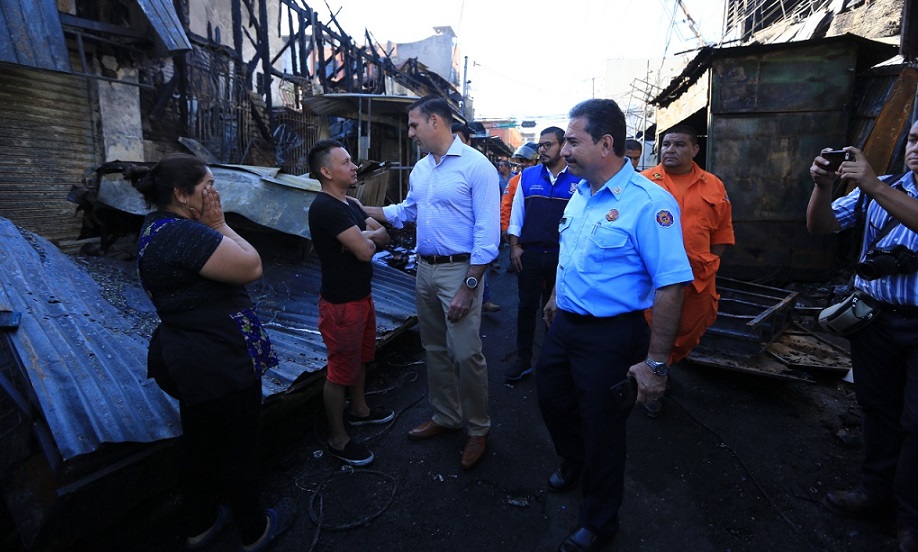 El alcalde de San Salvador, Ernesto Muyshondt, ayudará a los comerciantes afectados por un fuerte incendio ocurrido en la 1era calle poniente y 3 era avenida sur, en el Centro capitalino.