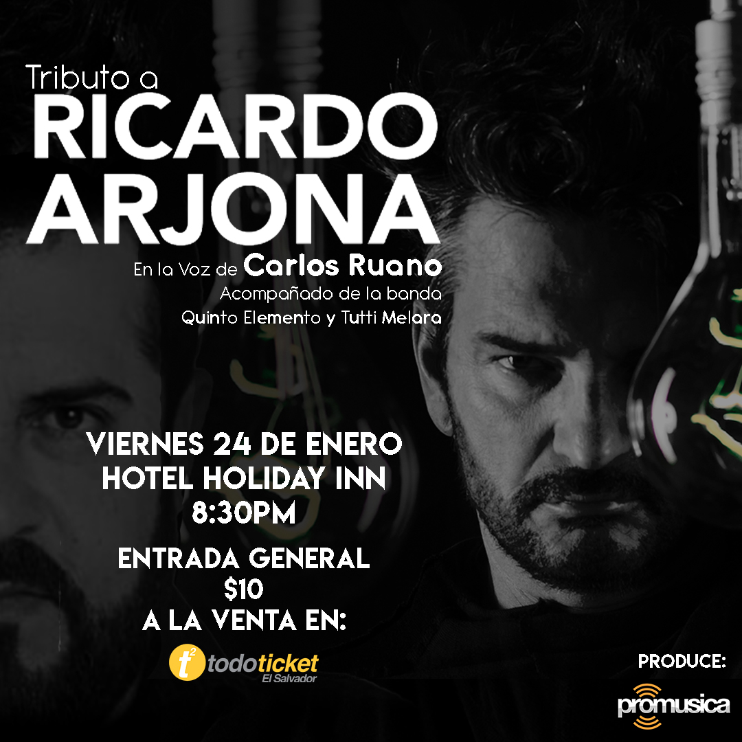 El concierto se llevará a cabo este viernes 24 de enero, Hotel Holiday Inn, 8:30PM, entradas $10 a la venta en TodoTicket. https://todoticketsv.com/tributo-ricardo-arjona y el día del evento. Este es un evento bajo la producción de Promusica.