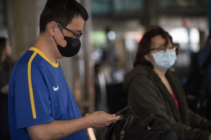 Pasajeros con mascarillas como medida de protección contra la propagación del nuevo coronavirus llegan al aeropuerto internacional de Sao Paulo, en Sao Paulo, Brasil, el 26 de febrero de 2020. (AP Foto/Andre Penner)