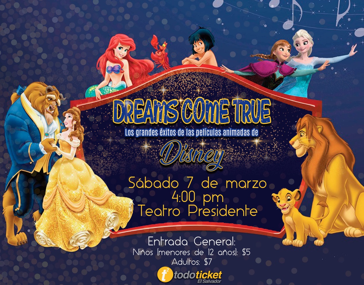 El concierto se llevará a cabo este sábado 07 de marzo en el Teatro Presidente a las 4:00 p.m. Los boletos tienen un valor de $5 (niños menores de 12 años) y $7 adultos, a la venta en Todoticket. https://todoticketsv.com/dreams-come-true