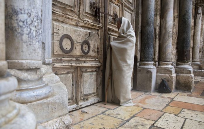 El canto de un pequeño grupo de clérigos al interior de la iglesia del Santo Sepulcro en Jerusalén se escuchaba tenuemente a través de las pesadas puertas de madera, mientras algunas pocas personas se detuvieron y arrodillaron afuera para orar. La iglesia centenaria, construida en donde los cristianos creen que Jesús fue crucificado, enterrado y resucitó de la muerte, suele estar atiborrada de peregrinos y turistas.