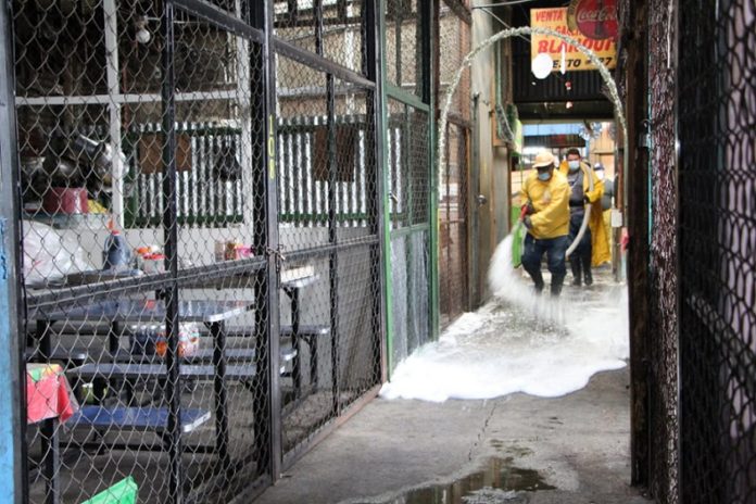 La alcaldía de Mejicanos realiza este lunes una jornada de limpieza y de desinfección en plazas, mercados y calles de la zona del centro de ese municipio, como una medida de contención ante la emergencia por el virus COVID-19.