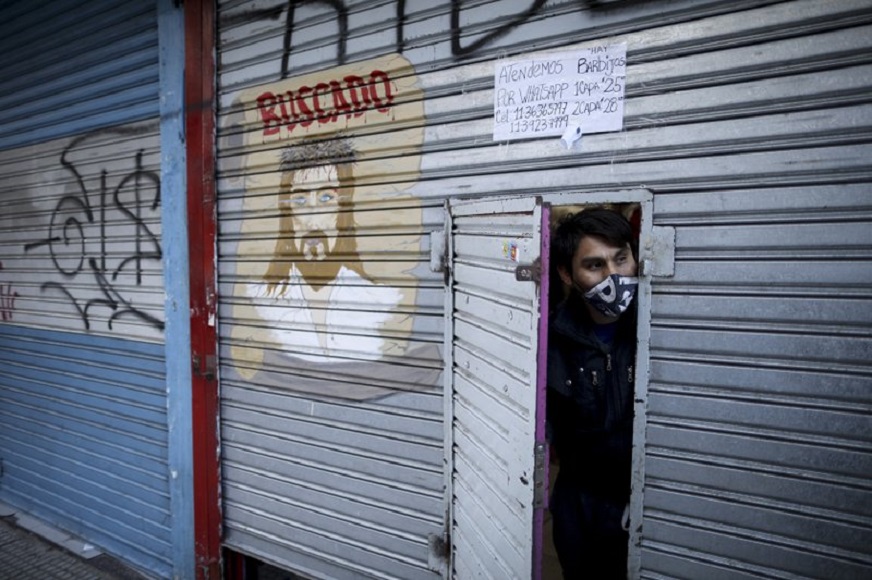 “Está bien que el gobierno tenga que tomar medidas contra la pandemia, pero no se pone a pensar en los comerciantes, que nos friega (perjudica), no podemos pagar el alquiler”, dijo el desesperanzado hombre a The Associated Press mientras asomaba la cabeza por la portezuela. Sobre la persiana de su negocio se podía ver una imagen del rostro de Jesucristo pintada y por encima la leyenda “Buscado”.
