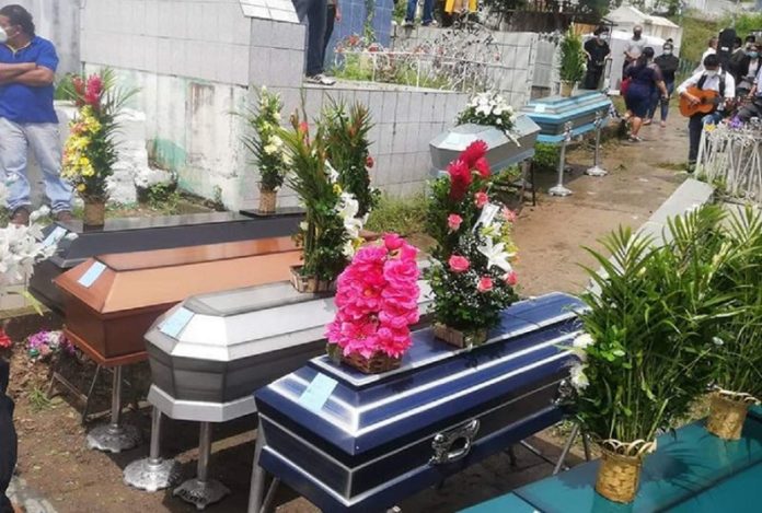 Siete carrozas fúnebres partieron de una iglesia cristiana hacia el cementerio municipal de San Marcos, donde transportaban los cuerpos de los miembros de la familia Melara Salamanca quienes fallecieron soterrados en Santo Tomás tras el paso de la tormenta Amanda.
