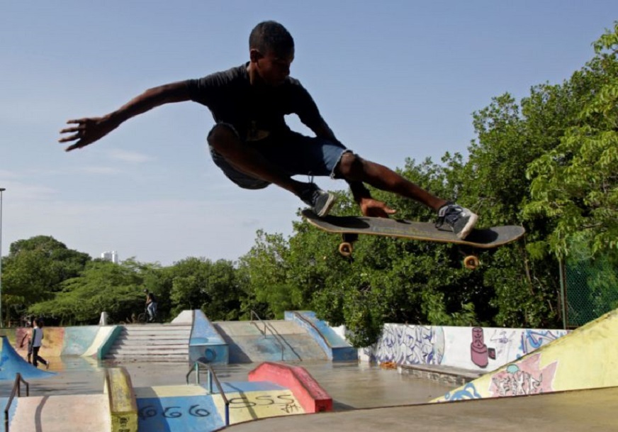 A sus 16 años, Wilson Marrugo dedica la mayor parte de su tiempo a la tabla con la que hace saltos de más de metro y medio de altura y otras maniobras.
