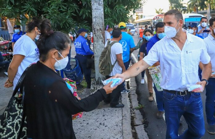 El alcalde de San Salvador, Ernesto Muyshdont, se trasladó a una de las paradas de buses de los alrededores de la Plaza Divino Salvador del Mundo para hacer un llamado a la población para que no dejen de usar mascarillas, se laven las manos y usen alcohol gel en la reapertura de la actividad económica.