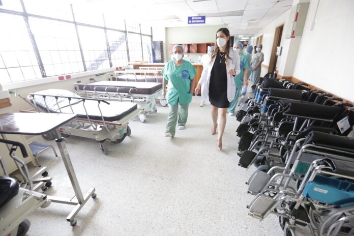 El recorrido incluyó el Hospital General, que pasó de 215 pacientes de COVID-19 ingresados “en el punto máximo de la pandemia” a solo 20 en la actualidad. “Diariamente atendíamos 125 consultas y ahora solo 12”, señaló la titular del ISSS.