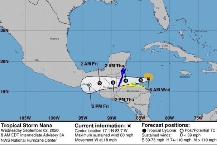 Los meteorólogos estiman que el centro de Nana estará sobre el norte Guatemala y el sureste de México a lo largo de este jueves y la próxima noche, para este viernes moverse al Golfo de Tehuantepec (al sureste de México).
