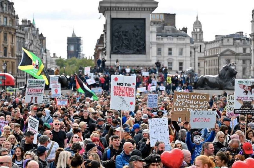 Miles de personas se reunieron el sábado en la Plaza de Trafalgar de Londres para protestar contra las medidas de confinamiento y distanciamiento social que las autoridades implementaron para frenar la propagación del COVID-19.