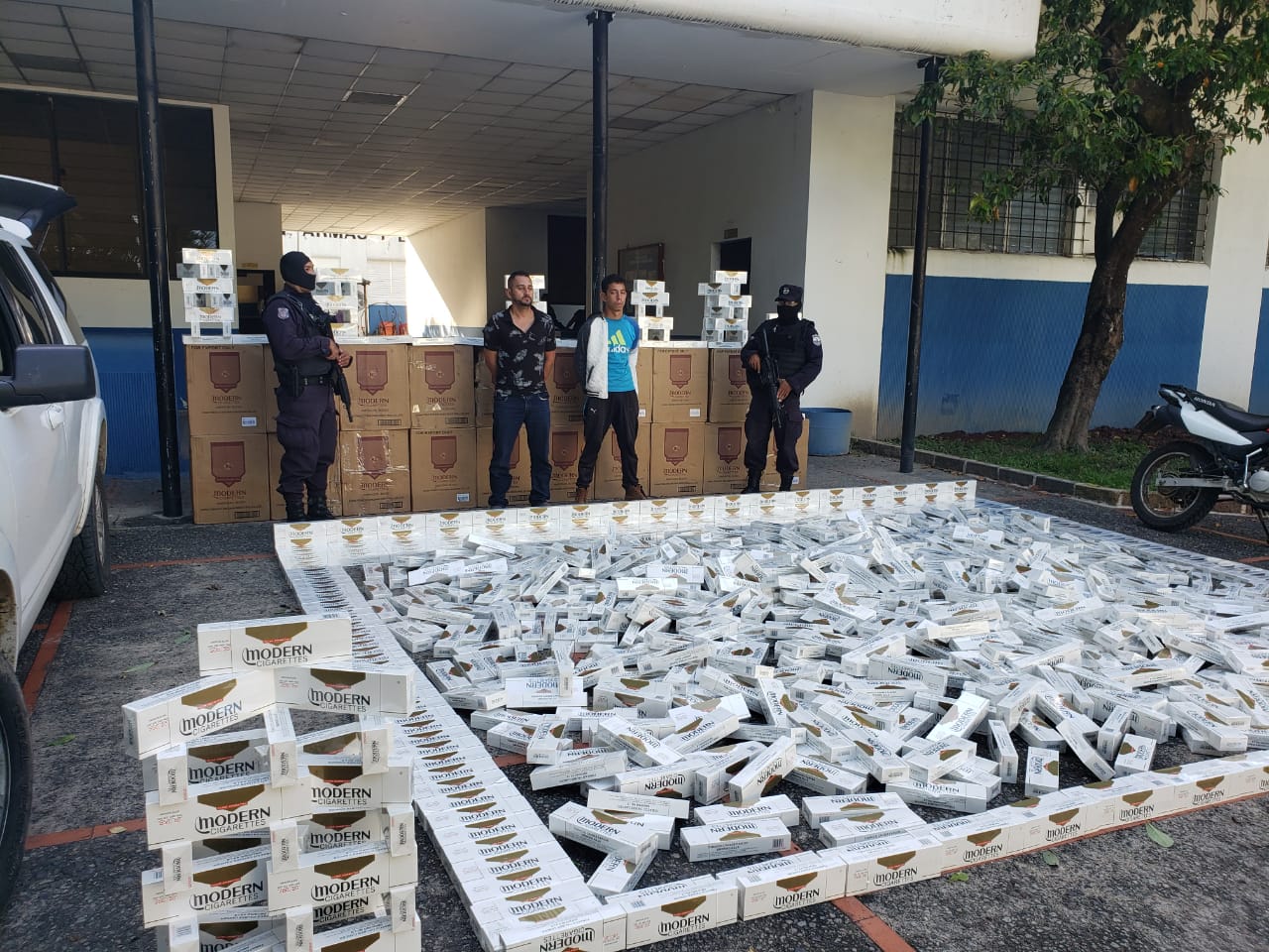 El procedimiento se realizó en el embarcadero conocido como Corral Falso, caserío Azacualpa, en el lago de Guija, Metapan, Santa Ana, cuando los ahora detenidos a se conducían a bordo de la camioneta Placas P 864 112, marca Ford, color blanco, donde transportaban 1,110 paquetes de cigarrillo de 10 cajetillas cada uno, de la marca Modern, de origen chino y de comercialización ilegal en nuestro país, con un valor comercial aproximado de $31,350.00.