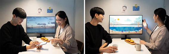 Para transformar tu estancia íntima en un aula de aprendizaje y de creatividad, Smart Monitor ofrece funciones que lo hacen posible. Cualquier actividad de esta naturaleza puede realizarse en un dispositivo y visualizarse en el Monitor inteligente. Por ejemplo, como parte de una clase de ilustración, haces un dibujo en tu teléfono inteligente y al tocar este en el costado del Monitor inteligente, puedes compartir tu creación en la pantalla más grande y verla más de cerca y en detalle.