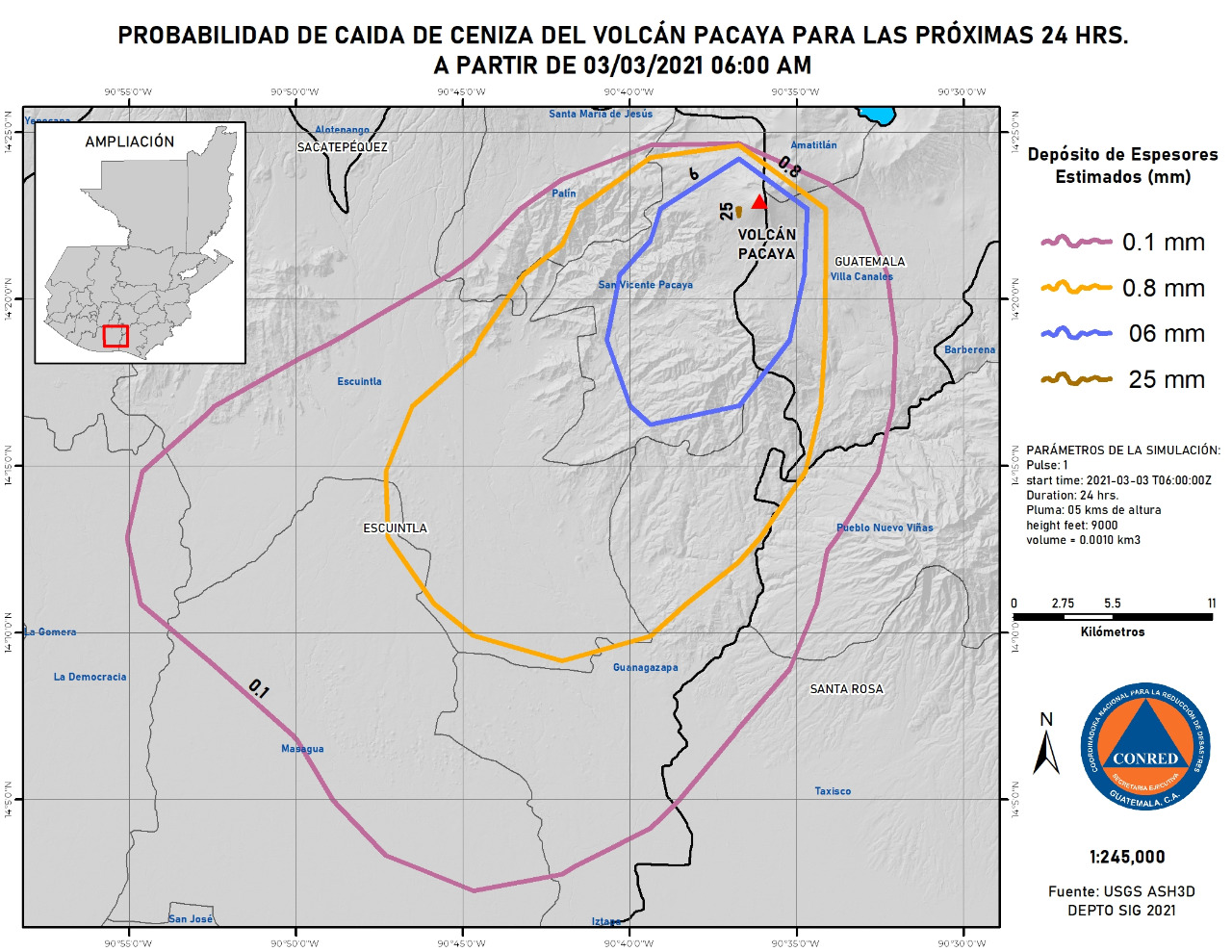 Se reporta caída de material volcánico en las aldeas El Patrocinio y El Rodeo, con probabilidades de caída ceniza en comunidades como Los Ríos, Los Jazmines El Rodeo, San José, finca Buenos Aires, aldea Pacaya, finca Río Frío y otras cercanas.
