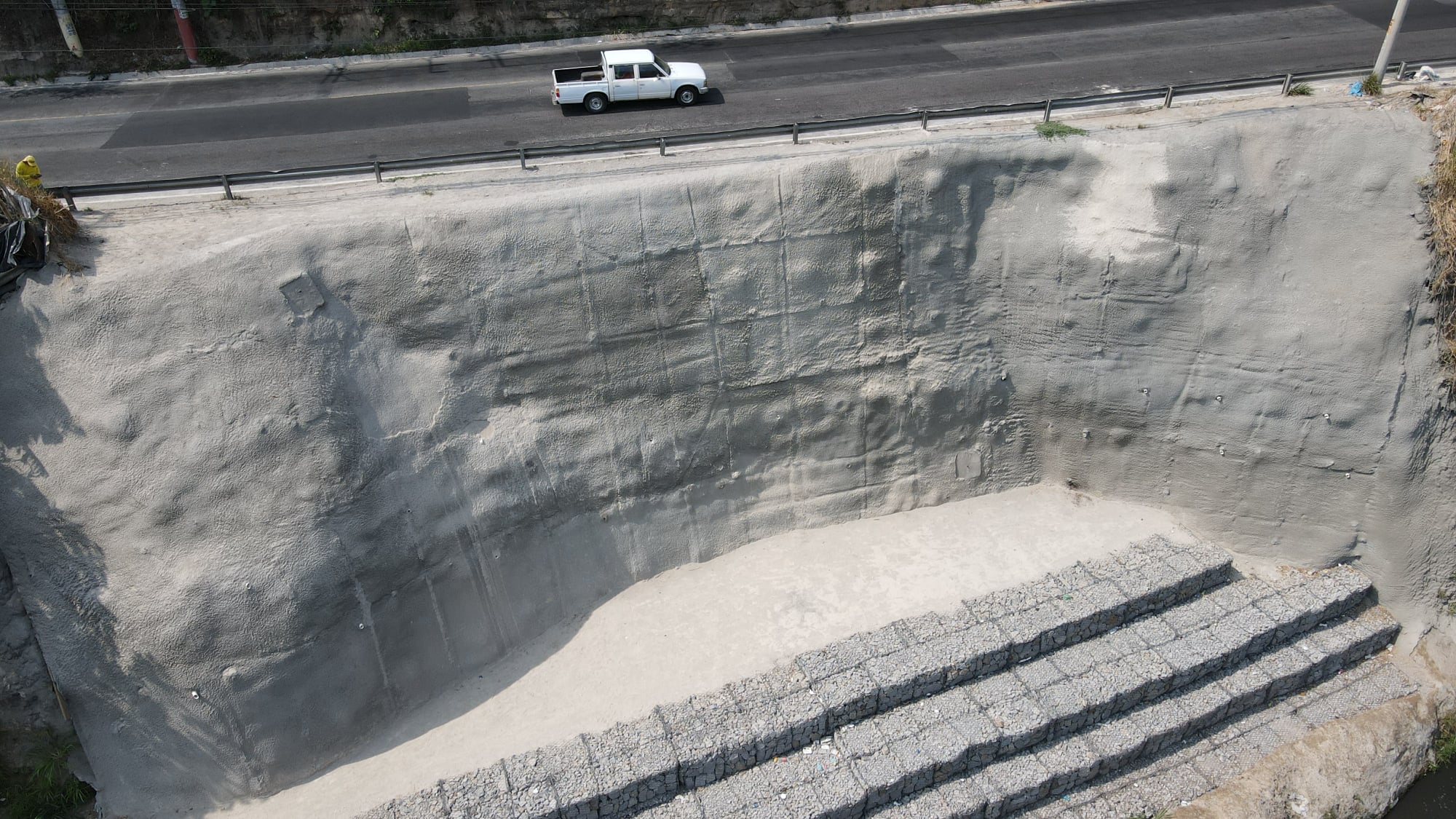 La obra consistió en la estabilización de un talud en el lateral inferior derecho de la vía, donde se implementó la técnica del enclavado de suelo para evitar hundimiento de la calle y deslizamientos de tierra que podrían obstruir el drenaje de la quebrada. Además, se construyó un gavión de 38 metros de longitud para aumentar la seguridad de la obra.