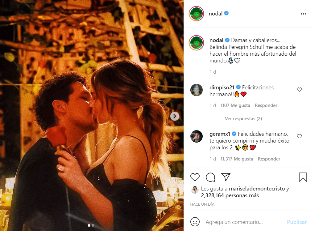 “Damas y caballeros, Belinda Peregrin Schull me acaba de hacer el hombre más afortunado del mundo”, ha anunciado en su cuenta de Instagram el intérprete de Pa’ Olvidarme De Ella, acompañado de una imagen donde la actriz sale con una rosa y un inmenso anillo con esmeraldas. Con la misma imagen y siguiendo el estilo de declaraciones románticas, Belinda ha escrito: “La mujer más feliz del mundo”.