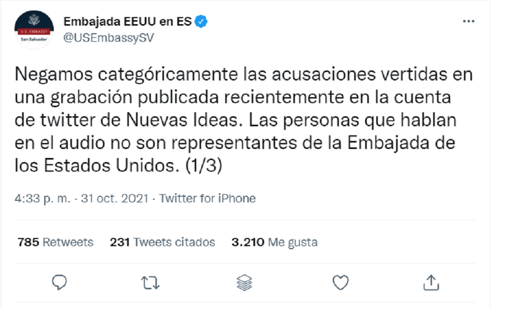 «La embajada de los Estados Unidos niega categóricamente las acusaciones vertidas en una grabación publicada recientemente en la cuenta de Twitter de Nuevas Ideas», indicó un portavoz.