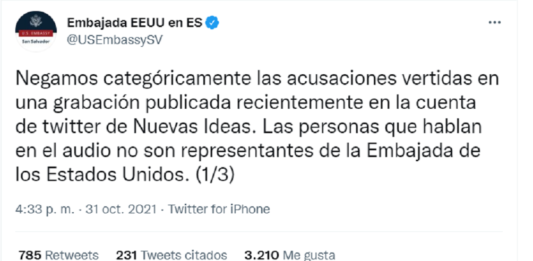 San Salvador, 31 oct (EFE).- La embajada de Estados Unidos negó este domingo «categóricamente» las acusaciones de que su representación diplomática en El Salvador supuestamente apoyaría una «conspiración» contra el partido oficialista Nuevas Ideas (NI). «La embajada de los Estados Unidos niega categóricamente las acusaciones vertidas en una grabación publicada recientemente en la cuenta de … Sigue leyendo EE.UU. niega la acusación de que apoyaría dividir al oficialismo en El Salvador