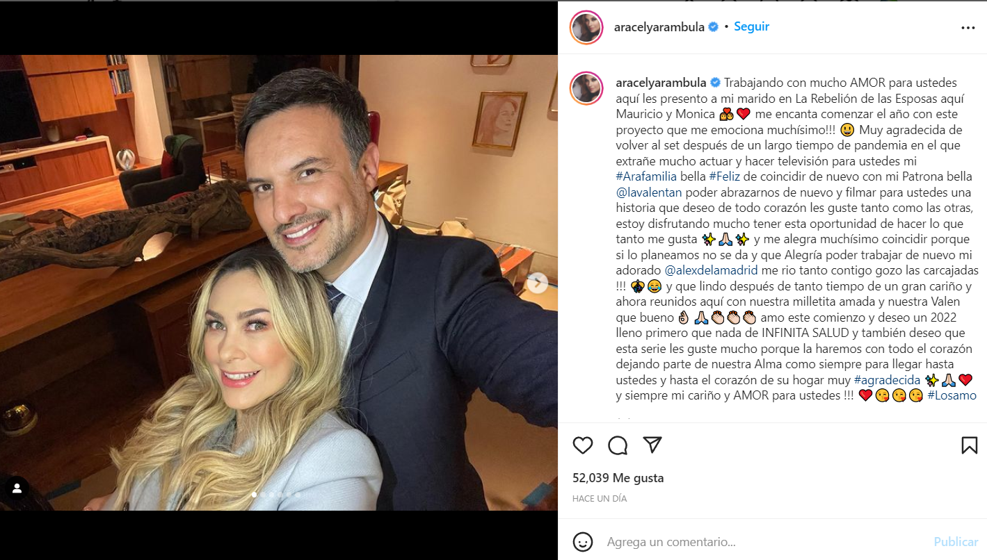 En el proyecto, que aún no tiene fecha de estreno, actúan la actriz trans chilena Daniela Vega, Adriana Paz, Aracely Arámbula y Ana Serradilla. Aracely también presumió a través de Instagram al galán que interpretará a su esposo dentro de esta nueva serie, se trata del actor mexicano Alejandro de la Madrid, quien ha participado en diferentes telenovelas y series como Te acuerdas de mí, Monarca 2 y El señor de los cielos. ‘Aquí les presento a mi marido en La rebelión de las esposas, aquí Mauricio y Mónica’, escribió Arámbula junto a una serie de fotografías en las que aparece en compañía de su esposo en la ficción. ’Estoy disfrutando mucho tener esta oportunidad de hacer lo que tanto me gusta […] y qué alegría poder trabajar de nuevo mi adorado Alex de la Madrid. Me río tanto contigo, gozo las carcajadas y qué lindo después de tanto tiempo de un gran cariño y ahora reunidos aquí’, agregó.