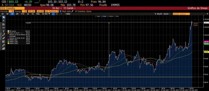 LONDRES, 24 feb (Reuters) – Los precios del petróleo saltaban el jueves y ambos contratos escalaban por encima de la marca de 105 dólares el barril por primera vez desde el 2014, luego de que Rusia atacó a Ucrania y exacerbó la inquietud por graves interrupciones en la cadena global de suministros.