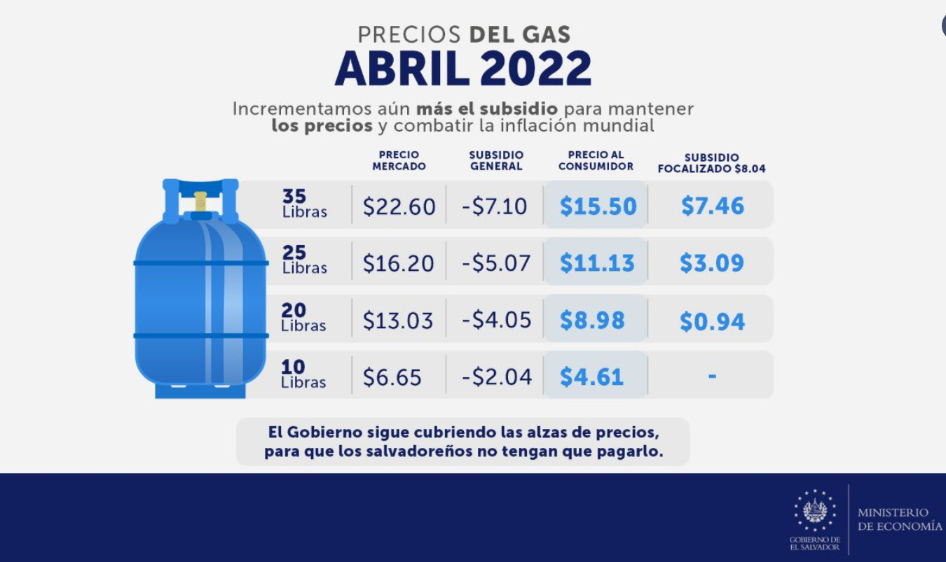 El MINEC informó que los precios de los cilindros de gas para consumidor final quedan de la siguiente manera: el de 35 libras a $15.50, y con el subsidio tradicional, $7.46; el de 25 libras a $11.13, y con el subsidio tradicional, a $3.09; el de 20 libras, a $8.98, y con el subsidio tradicional, $0.94; el de 10 libras, a $4.61, y con el subsidio tradicional, no tendrá que cancelar ningún monto.