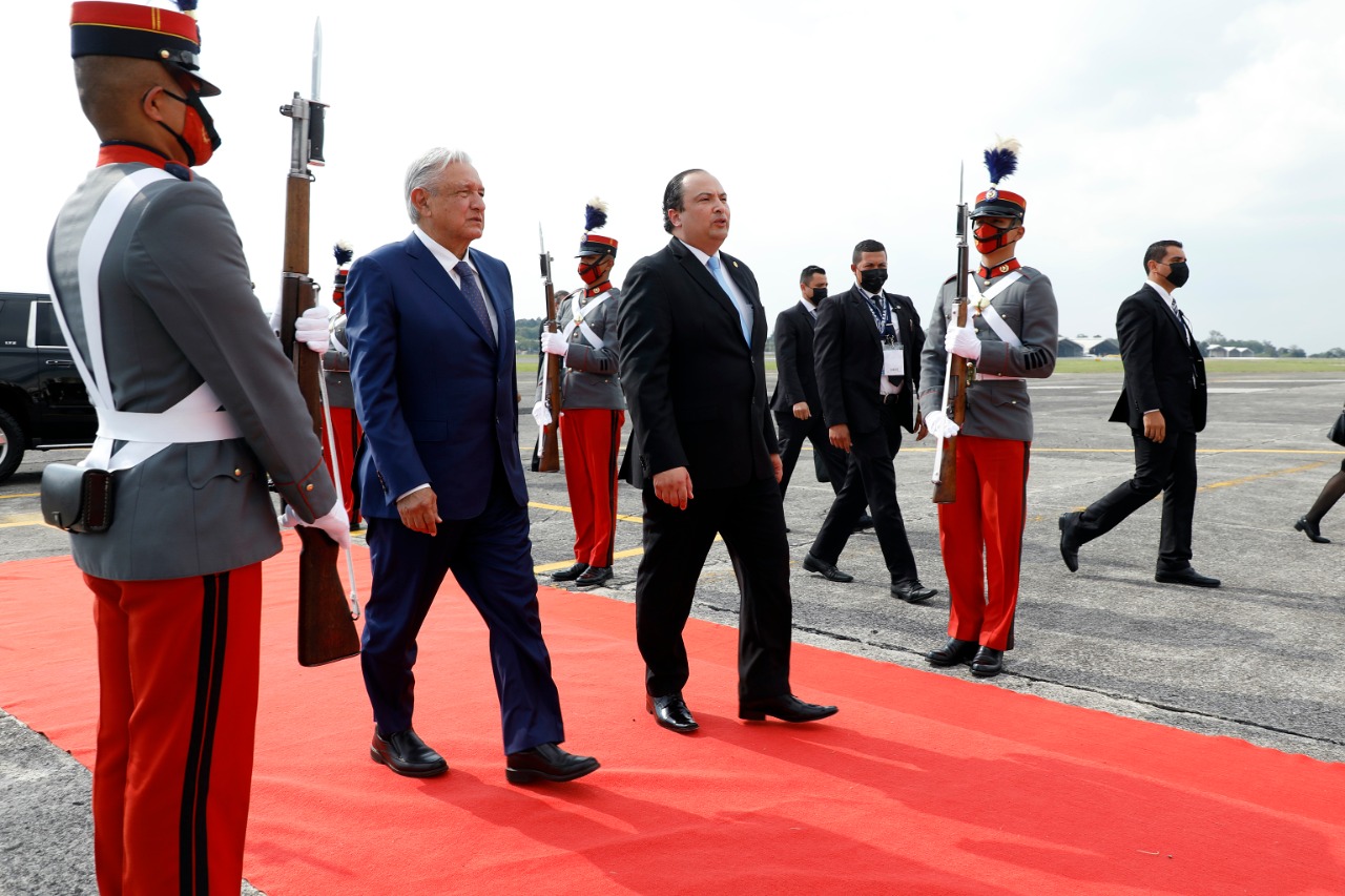 El presidente López Obrador fue recibido con honores en las instalaciones de la Fuerza Aérea de Guatemala.