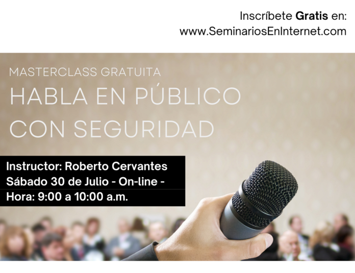 La Masterclass gratuita “Habla en público con seguridad” se llevará a cabo de manera online el sábado 30 de julio en horario de 9 a 10 a.m. Para poder atender a la misma, solo es necesario inscribirse en la página www.SeminariosEnInternet.com.