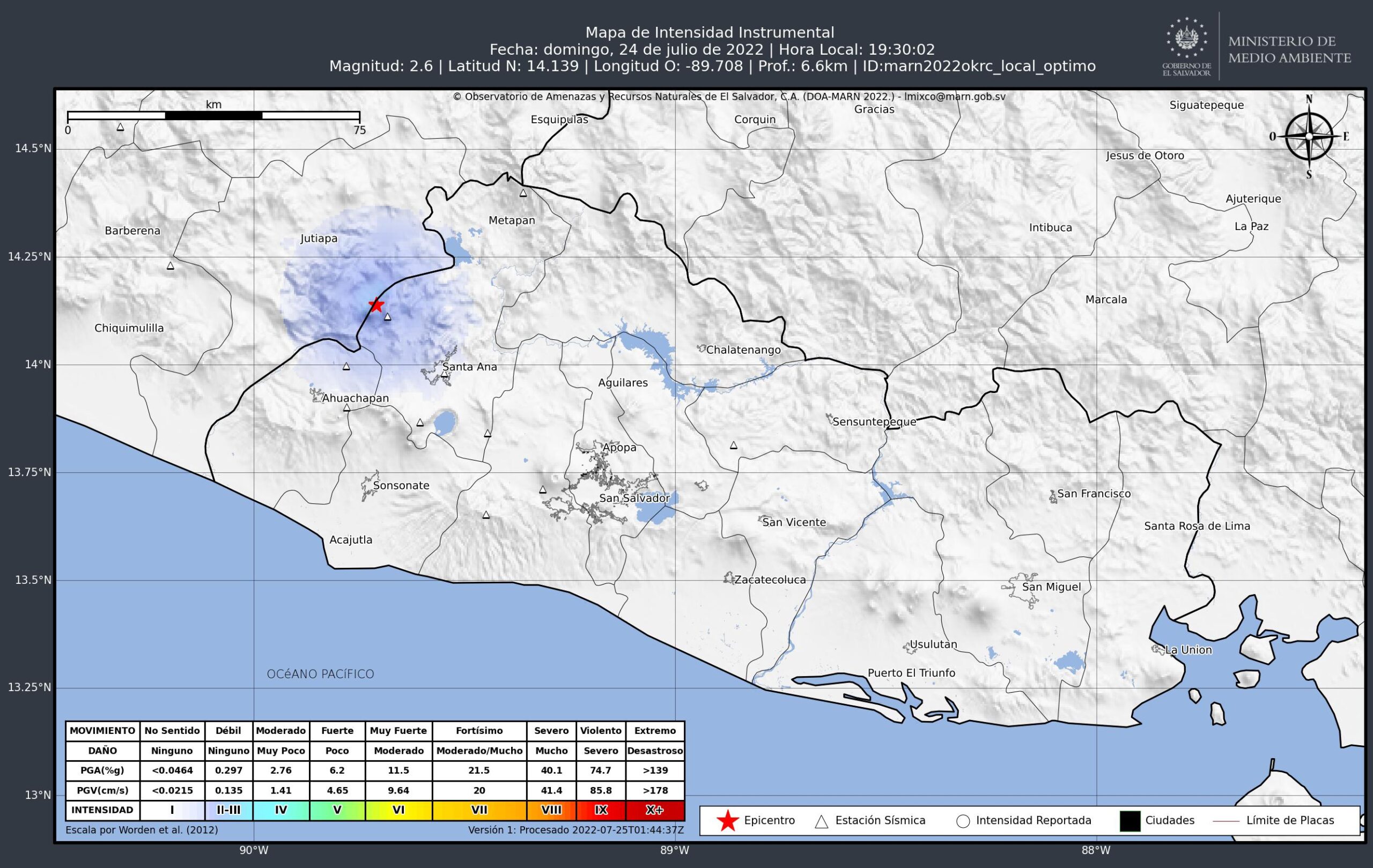 Los sismos se reportan desde el pasado 15 de julio hasta las 10:00 a. m. hasta este domingo y su magnitud oscila entre 2.4 y 4.4 en la escala de Richter; el de mayor magnitud ocurrió a las 2:41 a. m. del 15 de julio de 2022, con magnitud 4.4, profundidad de 6.0 km e intensidad V en la escala de Mercalli en Ahuachapán y San Lorenzo.