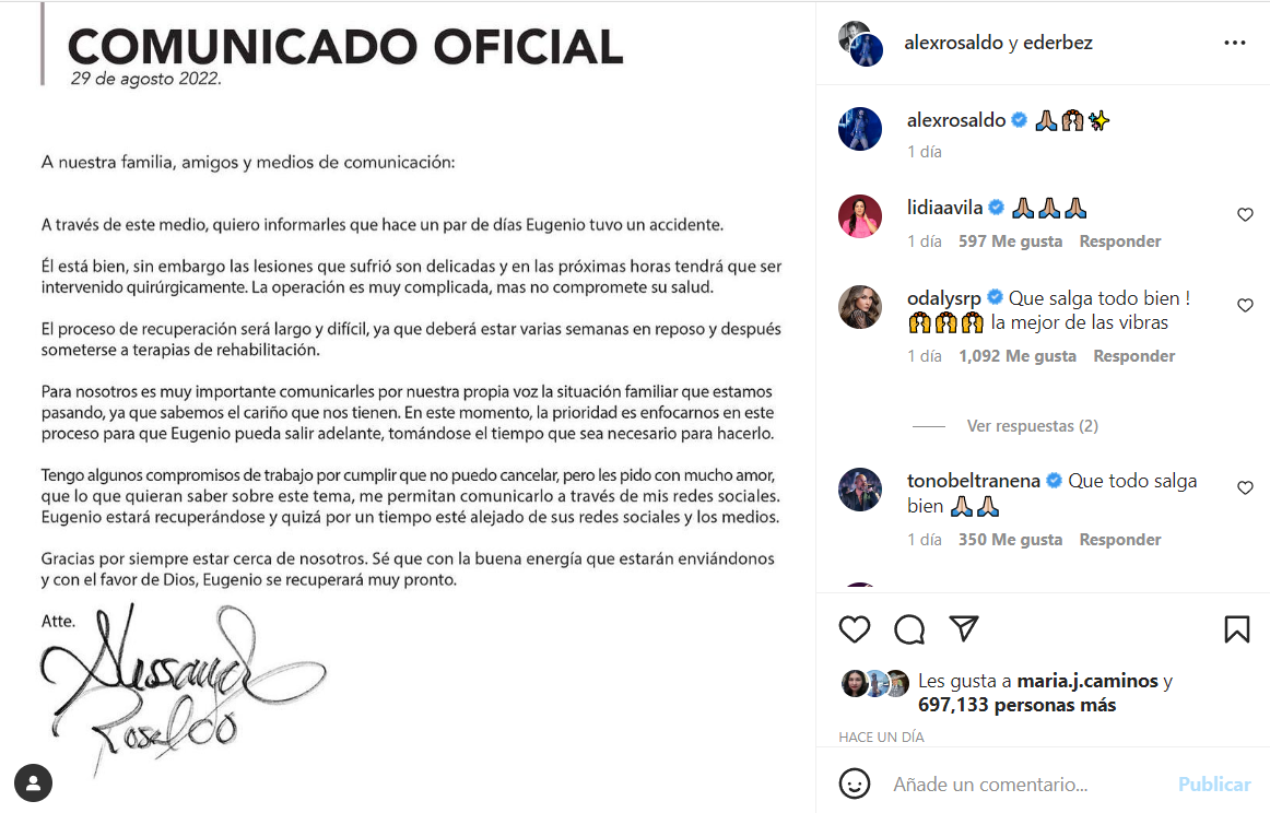 Según el medio Chisme No Like, la familia no quiso entrar en detalles, pero la realidad es que Eugenio tiene el hombro fracturado en varios pedazos ypor esa razón, Alessandra expresó que sería un largo proceso de rehabilitación.