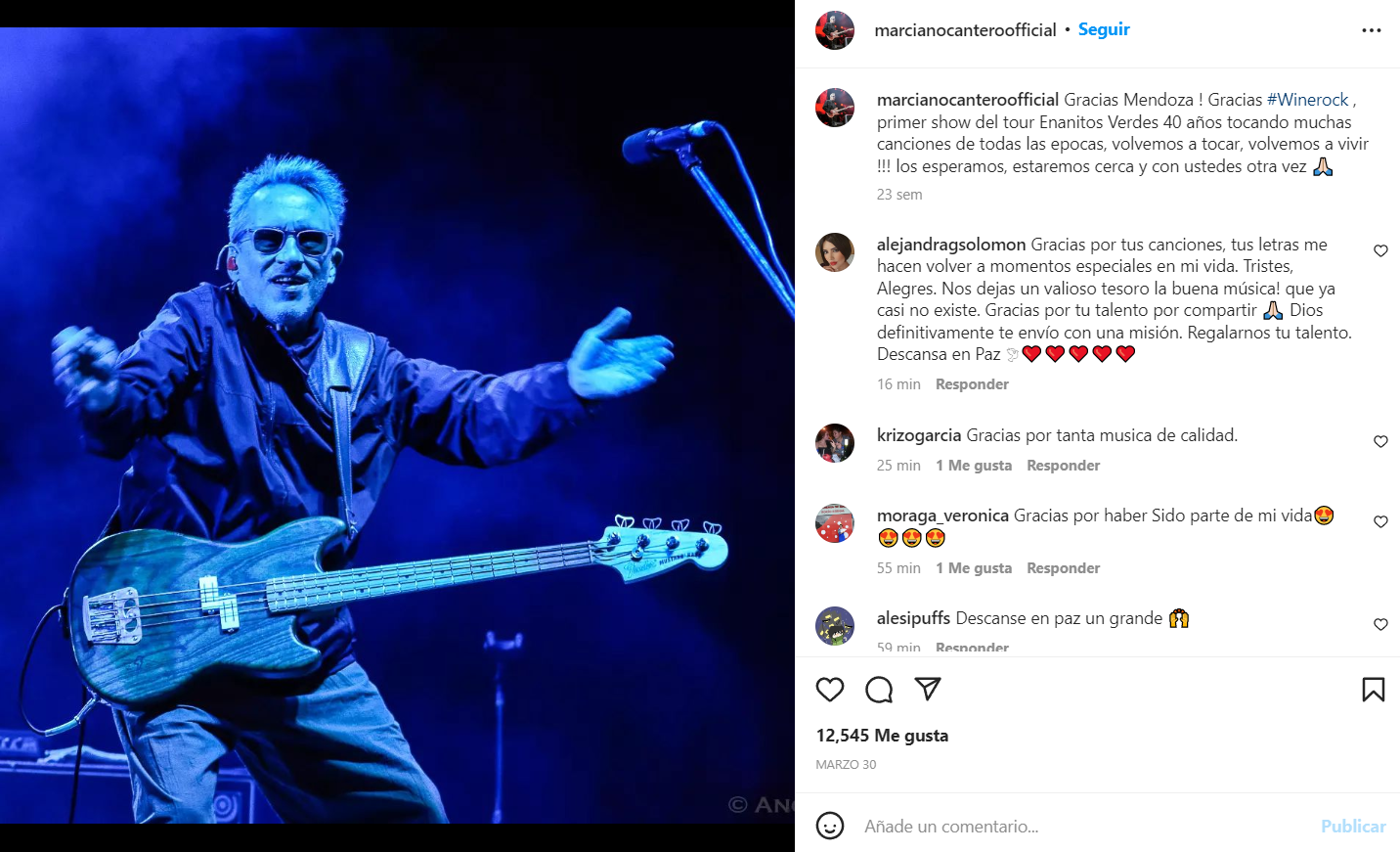 El 30 de marzo compartió Marciano Cantero su última publicación en las redes sociales, después del primer concierto de la gira para celebrar los 40 años de trayectoria de Enanitos Verdes.