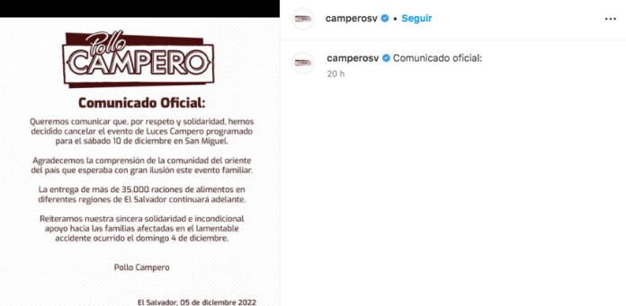 Pollo Campero ha comunicado la desición de cancelar el evento programado para el sábado 10 de diciembre en San Miguel.