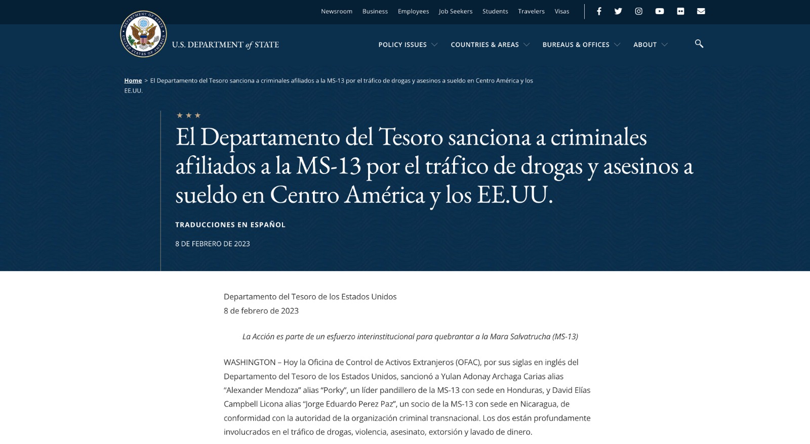 Simultáneamente la Oficina de Control de Activos Extranjeros (OFAC, por sus siglas en inglés) del Departamento del Tesoro de EE. UU. anunció sanciones tanto para “Porky” como para otro pandillero conocido como David Elías Campbell Licona, alias “ Jorge Eduardo Pérez Paz”, radicado en Nicaragua.