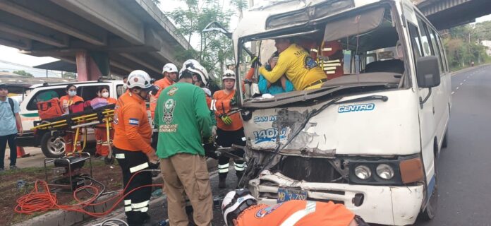“Voluntarios de Comandos de Salvamento y otras instituciones de PROCIVIL rescataron a 15 personas lesionadas en un choque de microbuses sobre el Bulevar del Ejercito en San Salvador. Fueron trasladadas al Hospital Amatepec, una profesora atrapada fue liberada”, mencionó Comandos de Salvamento.