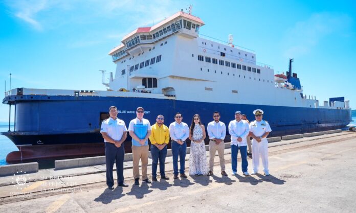 El Salvador recibió este jueves el buque Blue Wave Harmony, en el muelle multipropósito del Puerto de La Unión (PLU), como parte del inicio de operaciones del ferri que conectará El Salvador y Costa Rica, en los puertos de La Unión y Caldera respectivamente.