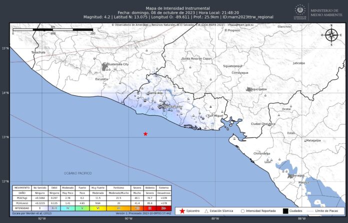 Además, en el mapa de intensidad el MARN dio a conocer que el sismo fue sentido en los departamentos de Ahuachapán, Sonsonate, La Libertad, San Salvador, La Paz, San Vicente y Usulután.