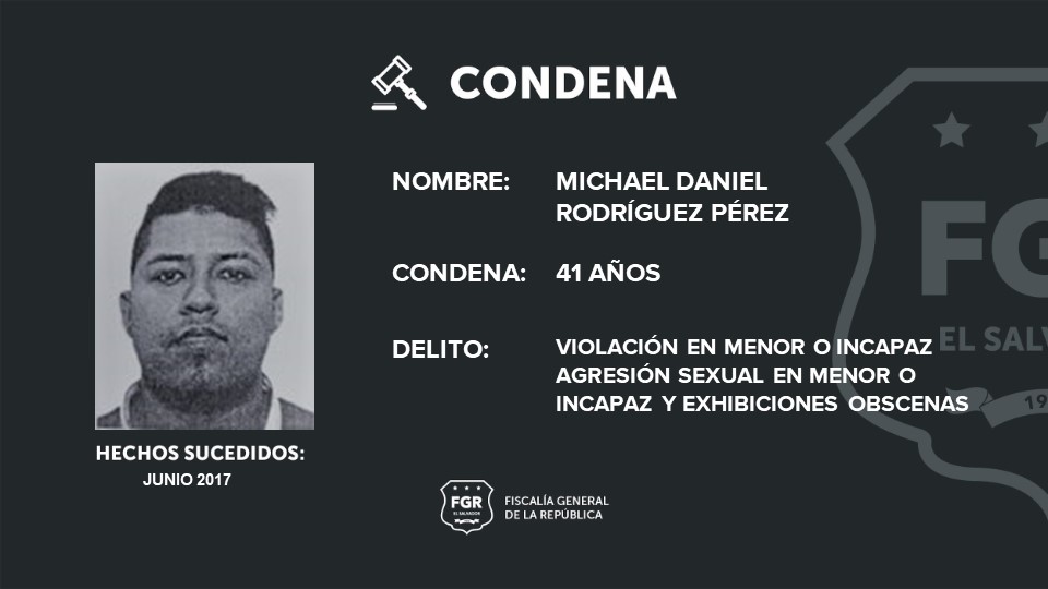 La Fiscalía General de la República (FGR), condenó a 41 años de cárcel a Michael Rodríguez Pérez por los delitos de Violación en Menor o Incapaz, Agresión Sexual en Menor o Incapaz y Exhibiciones Obscenas.