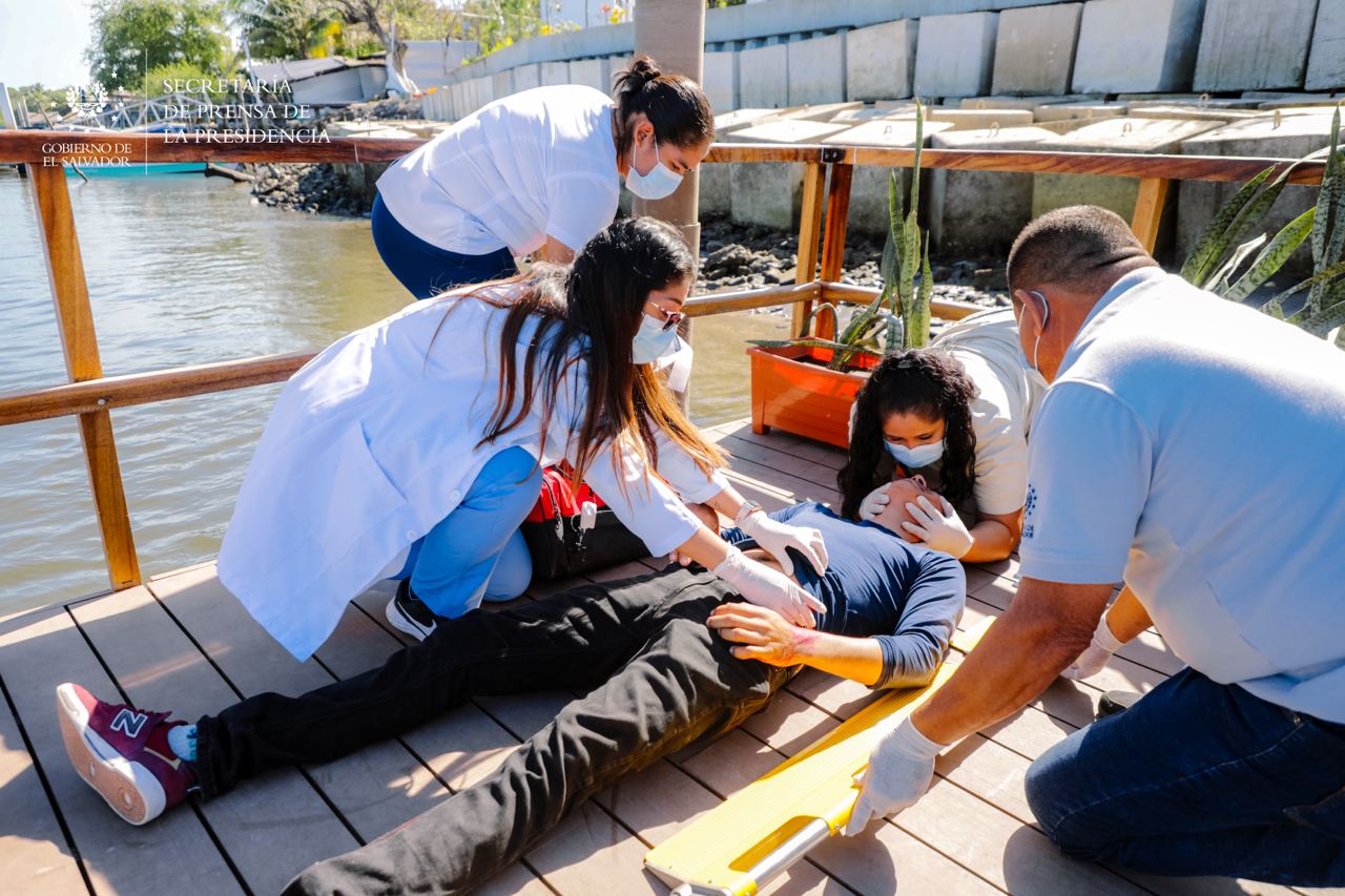 Para esta presentación se realizó un simulacro de atención a personas que resultaron lesionadas debido al volcamiento de una lancha, en el estero Jaltepeque, en este accidente se reportaron siete lesionados, algunos de ellos con crisis nerviosa.