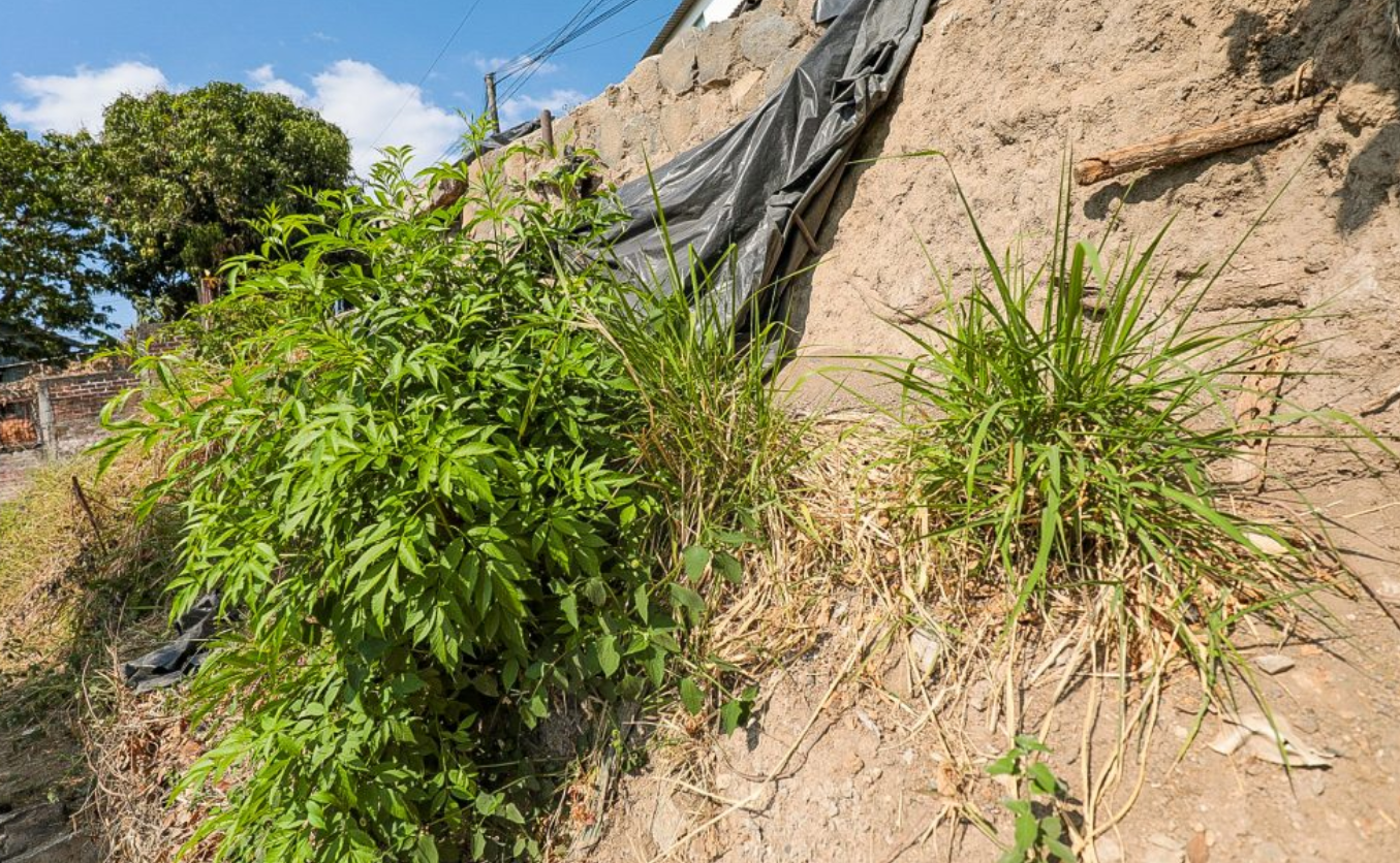 En Soyapango también avanzan los trabajos de mitigación en la colonia Brisas del Sur, donde se interviene un talud para construir un muro con el fin de generar estabilidad en un área de alto riesgo ante derrumbes y desprendimiento de tierra.