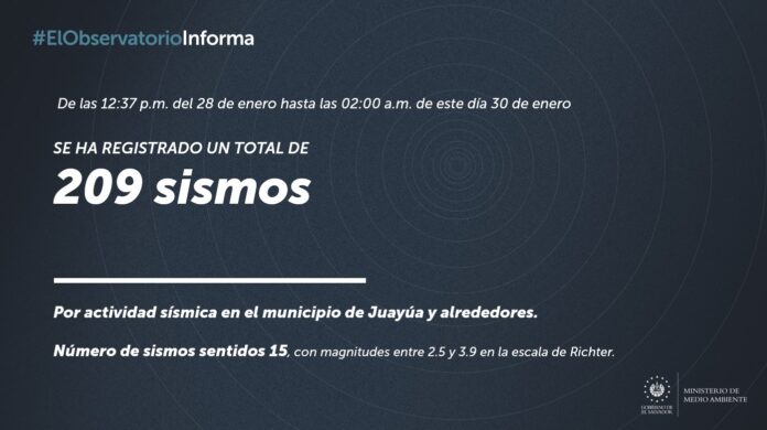 El Ministerio de Medio Ambiente y Recursos Naturales (MARN), registró 209 sismos entre las 12:37 del mediodía del 28 de enero y las 2:00 de la madrugada del 30 de enero.