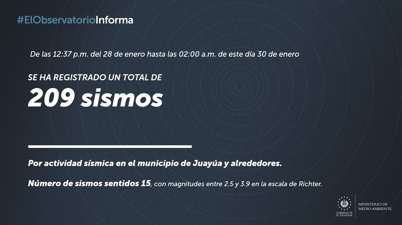 “#ElObservatorioInforma que se ha registrado un total de 209 sismos en Juayúa y sus alrededores, entre las 12:37 p. m. del 28 de enero y las 02:00 a. m. del 30 de enero de 2024”, dijo la Cartera del MARN.
