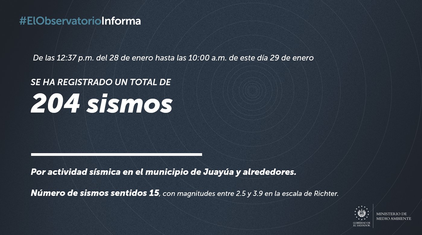 El Ministerio de Medio Ambiente y Recursos Naturales (MARN), informó por medio de redes sociales que se han registrado 204 sismos desde el 28 de enero hasta el 29 de enero.