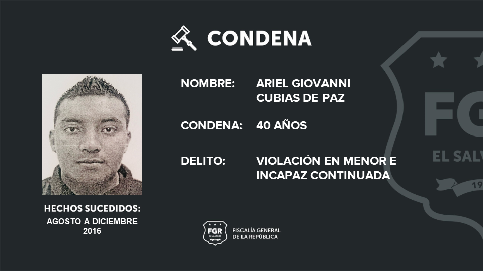 La Fiscalía General de la República (FGR), condenó a Ariel Giovanni Cubías de Paz a 40 años de cárcel por el delito de violación en menor e incapaz continuada a dos menores de edad, concretamente de 6 y 9 años.