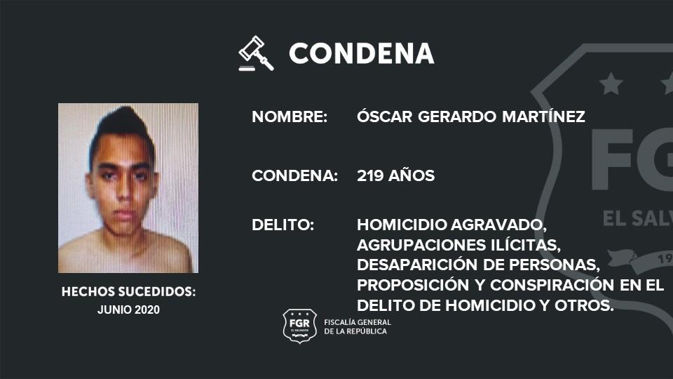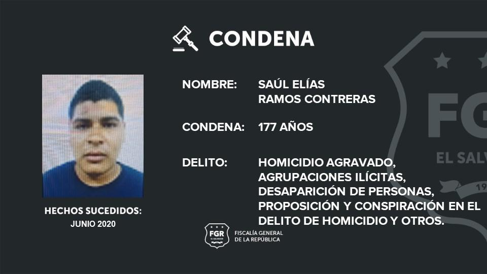 “Los pandilleros Óscar Gerardo Martínez y Saúl Elías Ramos fueron condenados a 219 y 177 años de cárcel respectivamente, luego de ser declarados culpables de participar en varios delitos”, dijo la FGR.