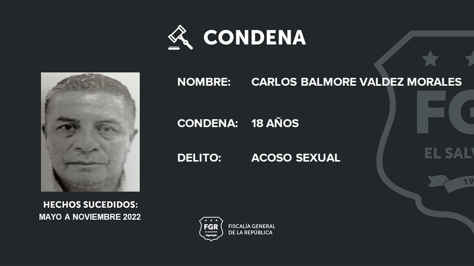“La Fiscalía General de la República logró hacer justicia para 5 estudiantes de octavo, quienes eran acosados sexualmente por Carlos Balmore Valdez Morales; al imputado se le impuso una pena de 18 años de prisión”, detalló la FGR.