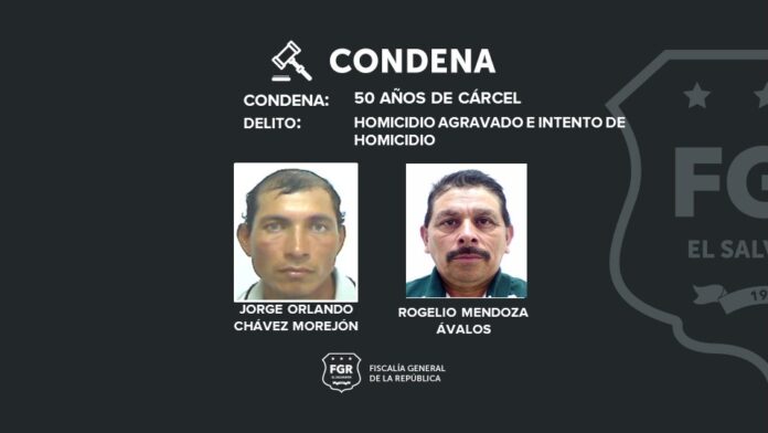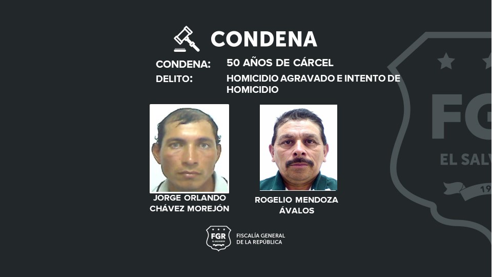 La Fiscalía General de la República (FGR), condenó a Jorge Orlando Chávez Morejón y Rogelio Mendoza Ávalos, sobre 50 años de cárcel por los delitos de homicidio agravado e intento de homicidio cometidos en Usulután.